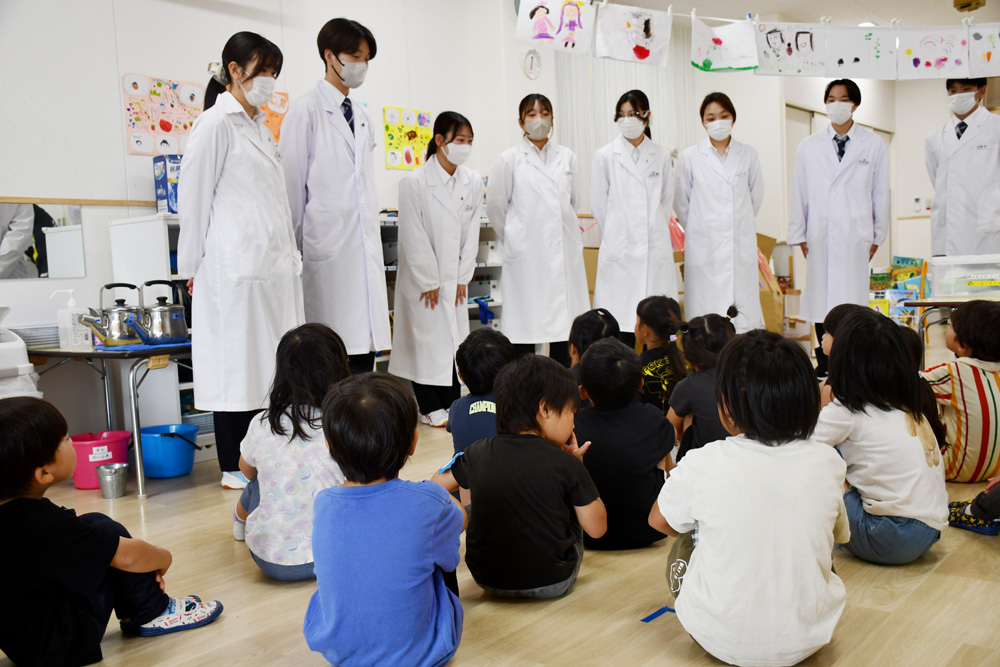 対象は5才児,にじ組,そら組,ほし組,3クラスの67名です。時間を変えて各クラスごとに実施しました。参加学生は1年1名,2年7名,4年1名の9名です。