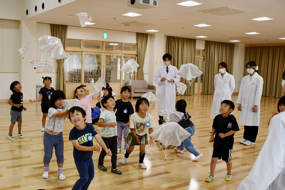 子どもたちは自分で作ったビニール袋のらっかさん(パラシュート),ペットボトルの空気でっぽうで,思い思いに楽しんでいました。遊びながら,らっかさんをながくふわふわさせるにはどう投げたらよいか,体全体を使って飛び跳ねながら何度も挑戦していました。
