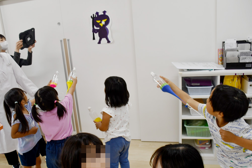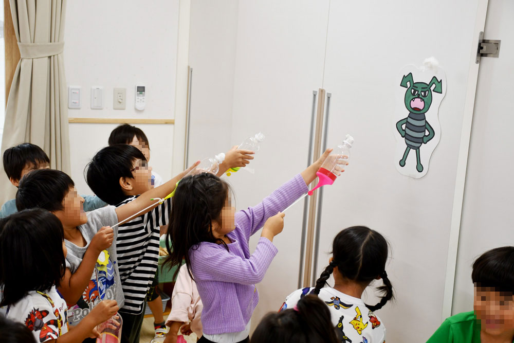 また,的あてに「ばいきん」のイラストを描いて,幼児全員が楽しめるようにしたところ,夢中になって何度もティッシュを飛ばしていました。見えない空気の力を感じてもらえたのではないかと思います。